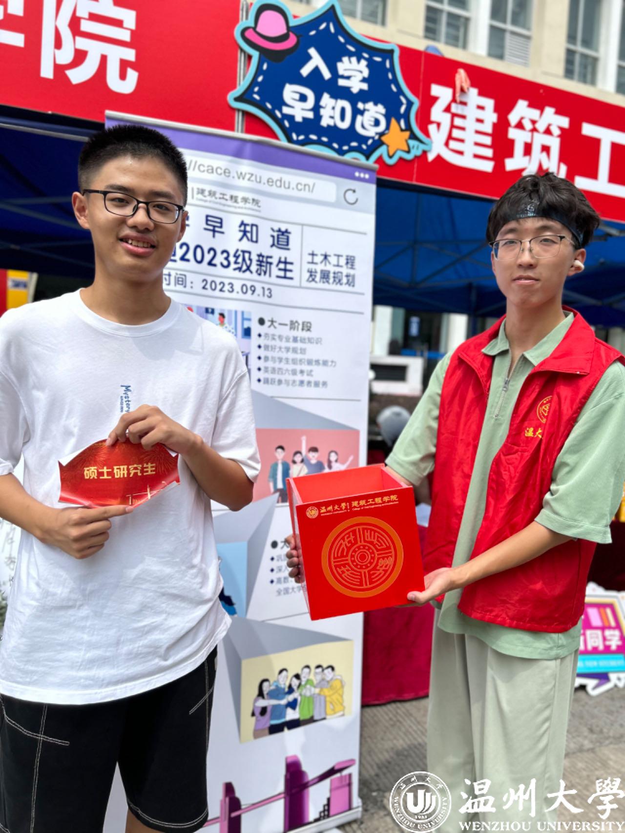 接待点“入学早知道”展板特别吸眼球,新生们纷纷驻足观看大学四年(五年)学业规划秘籍,并好奇地拆开毕业时自己的盲盒,然后迫不及待地寻找规划锦囊,领取1000页的“红方砖”记事贴。