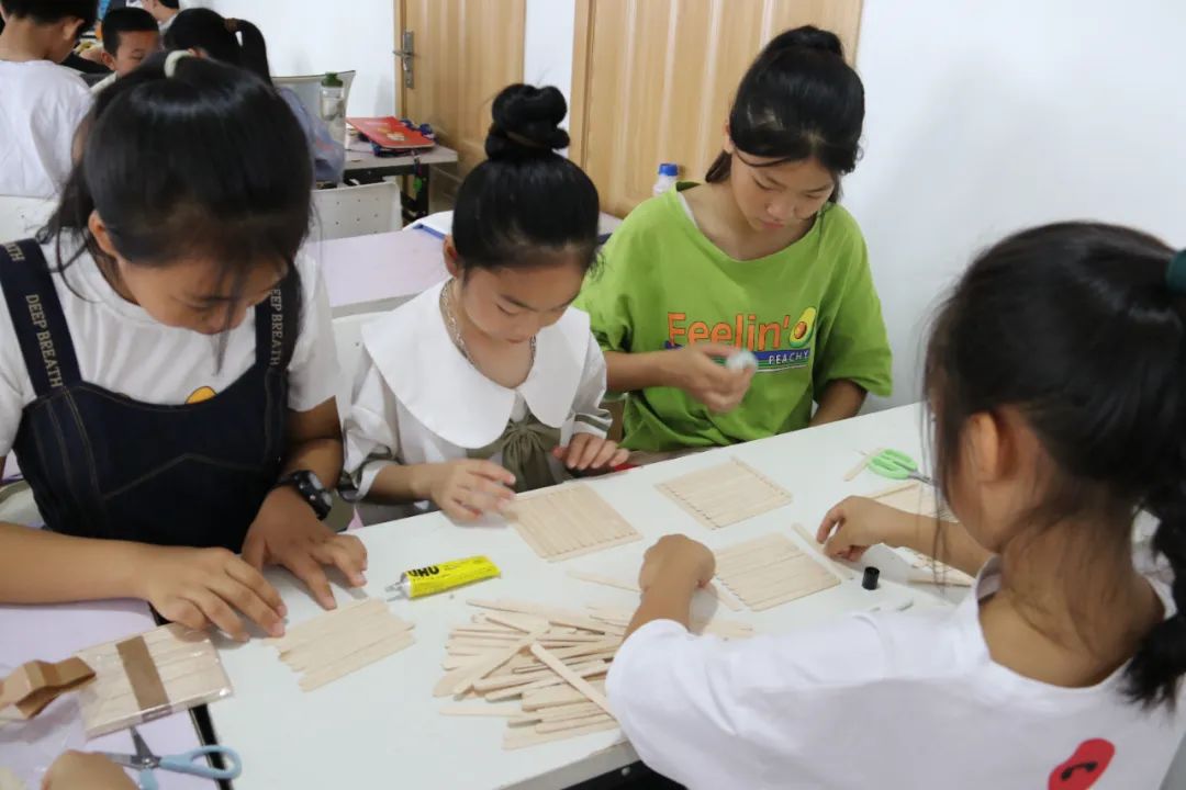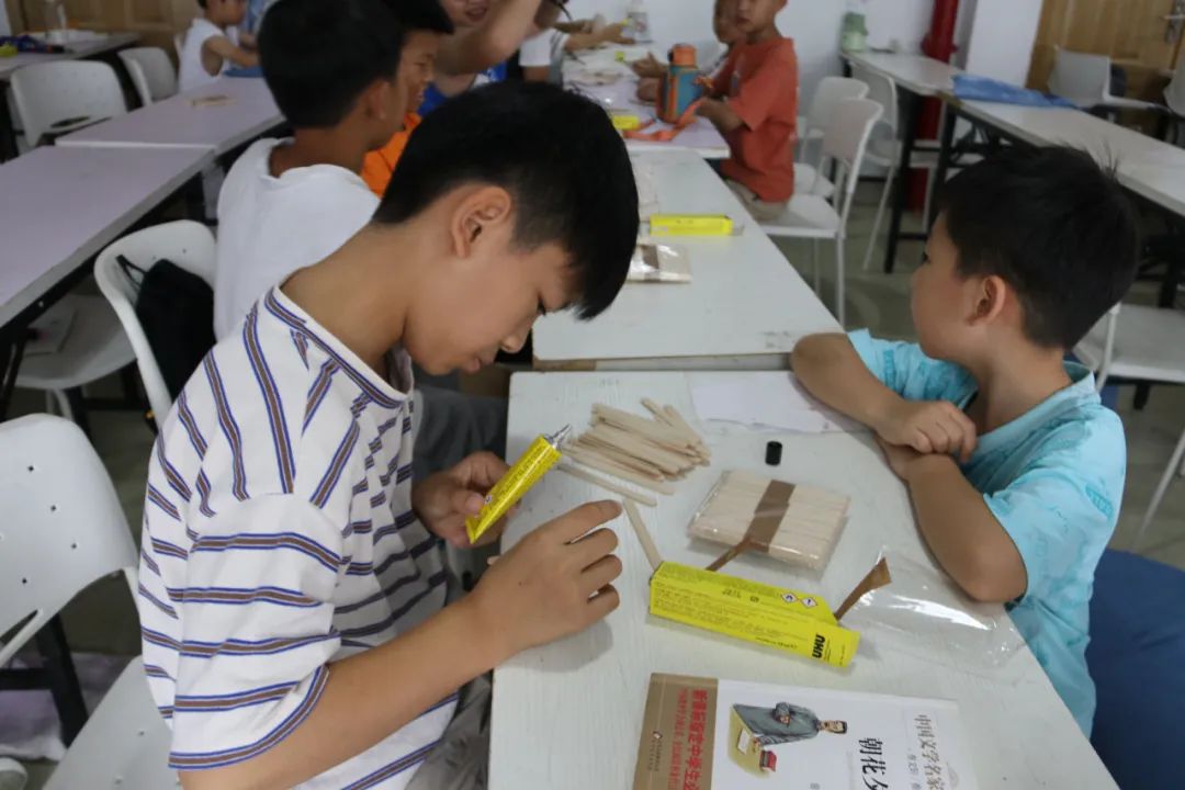 活动中,大学生志愿者们发挥自己的专业特长,向孩子们讲述历史气息浓厚的温州古建筑,并以图文影视等方式带领他们观赏鹿城中山公园、江心屿文天祥祠,温州妙果寺、三垟周氏旧宅,龙湾永昌堡、瑞安圣井山石殿、洞头望海楼、乐清百岁亭等古建筑,讲述一个个有趣的故事。在孩子们一声声惊叹中,进入到本次课程的高潮部分——化身小小建筑师,搭建独特风格的建筑。大学生志愿者们将孩子们分成多个小组指导他们设计建筑图并动手实验,引导孩子们建地基、搭木房、配装饰等。在这期间,每一个孩子都积极地参与,表达自己的想法,利用雪糕棍和胶水将想法付诸于作品,最后的成品都栩栩如生。