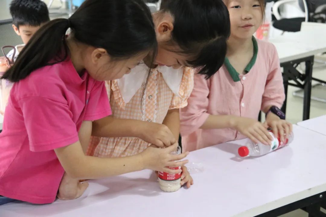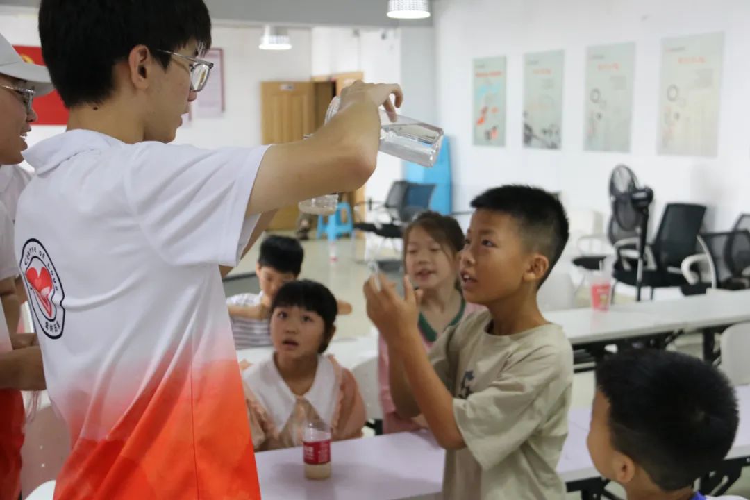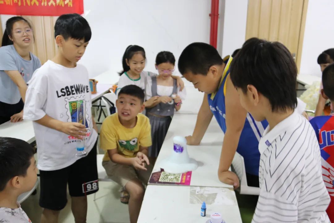 实验过程中,大学生志愿者将孩子们分成六个小组,小组化管理指导他们进行安全实验。为使得实验效果更加明显,志愿者还挑选了不同颜色的色素加入试剂。实验终于开始了,孩子们兴奋又好奇地围在老师身边,观看到大量的泡沫喷薄出多彩的画面,这神奇有趣的现象引得孩子们发出一阵阵惊呼。每次泡沫“嗖”地像喷泉一样从容器中喷涌而出,似巨大的“牙膏”,也酷似大象的鼻子,把孩子们惊讶成一个个表情包。实验结束后,志愿者们带领孩子们清理实验后杂乱的桌面。而此时,孩子们仍然很兴奋,仍然沉浸在做实验的乐趣中。