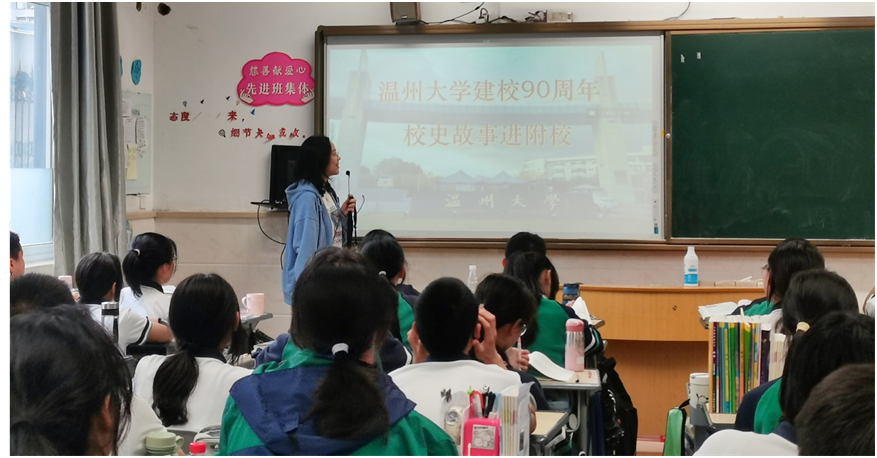 外国语学院“我是中国人”双语创新实践团队队员在温大附中、仙岩二中及丽岙华侨小学三所中小学宣讲温大创校故事,为温大送上一份特别的生日祝贺。引导侨乡少年通过学习“三元券”筹资建校等温大校史故事,加深对温大发展与温州历史的了解,培养拼搏奋斗的精神与团结奉献的意识。