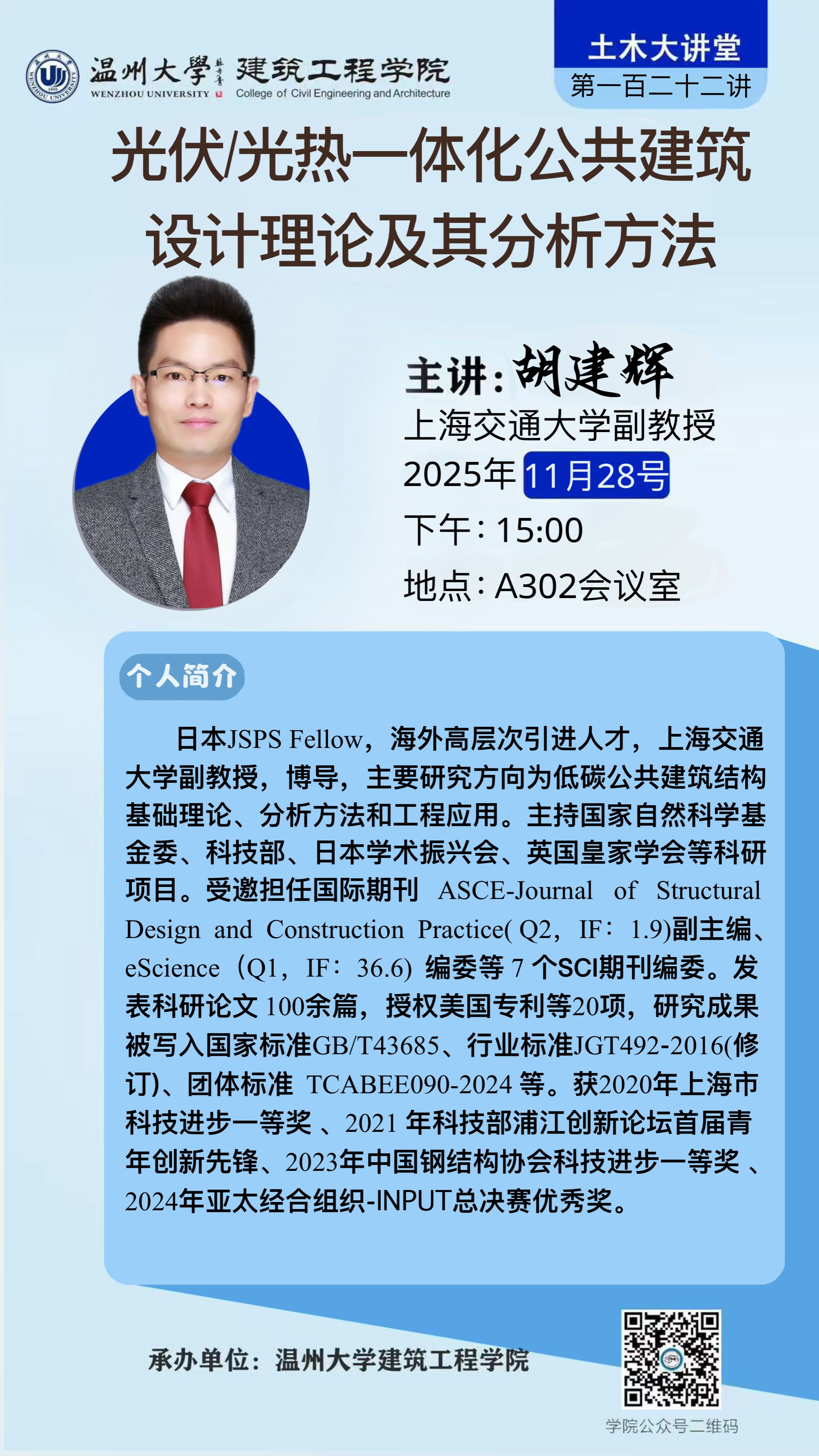 学术讲座预告:光伏/光热一体化公共建筑设计理论及其分析方法