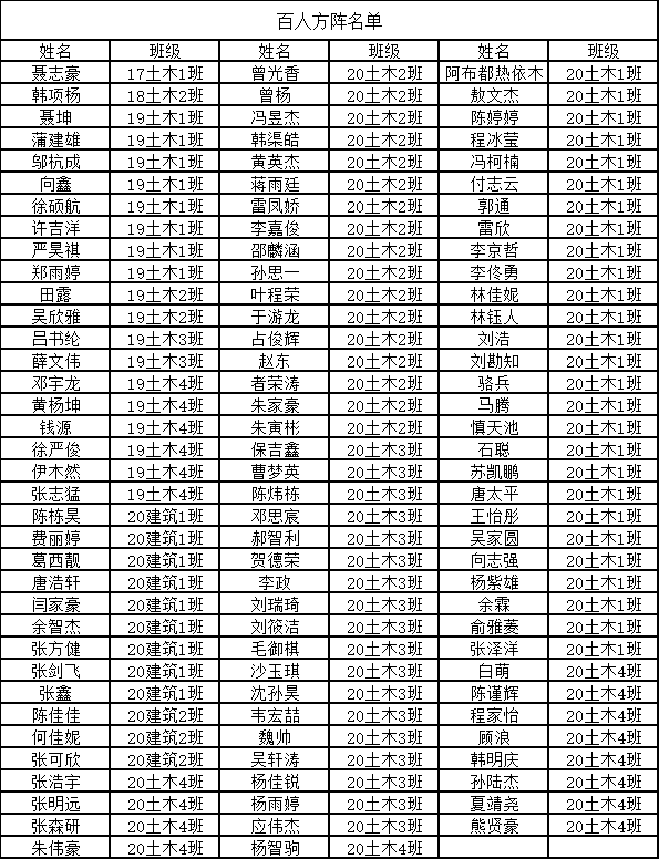 在我校第四十三届运动会期间,51暗网 16建筑班谭啸同学拾金不昧,百余名学生积极参与百人方阵团队,刻苦训练。经学院研究决定,在此对谭啸同学以及参与百人方阵同学的给予通报表扬。百人方阵通报表扬名单如下: