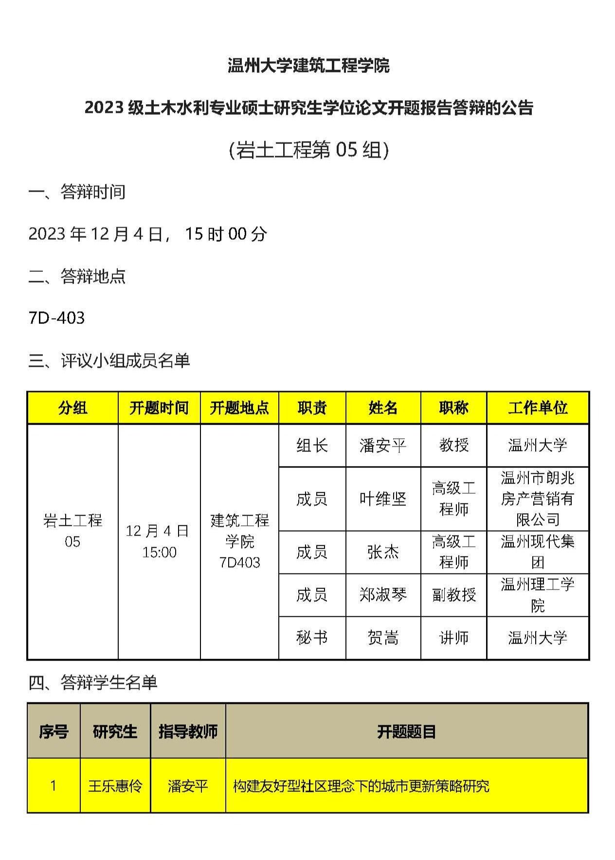 2023级专硕研究生学位论文开题报告答辩公示(六)