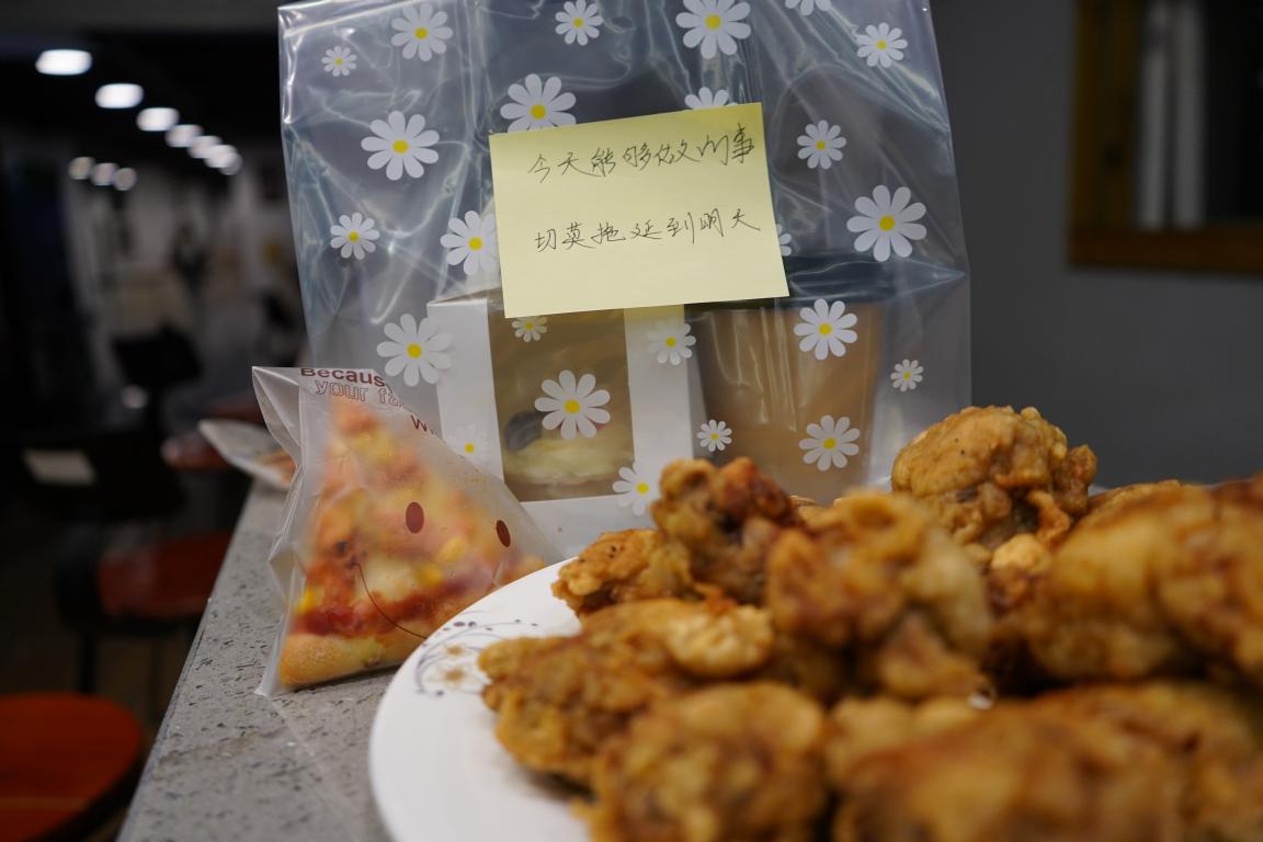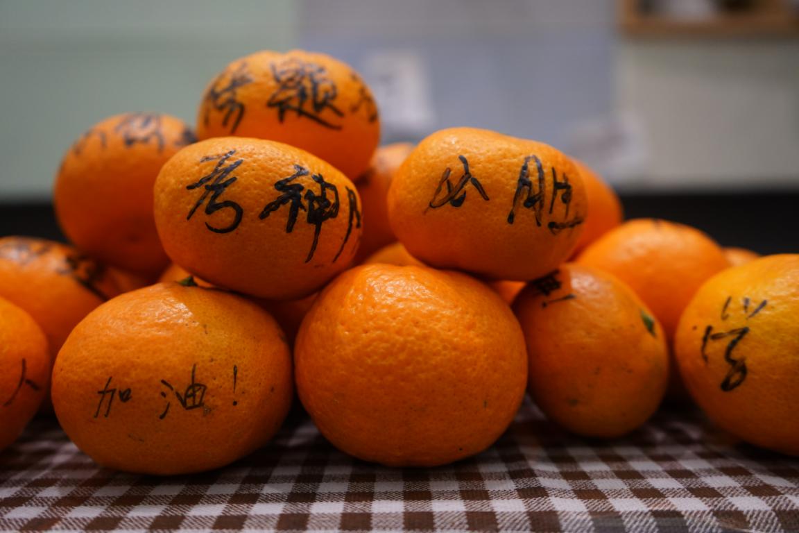 爱心夜宵不仅包含了学弟学妹们亲手制作的热牛奶、小蛋糕、鸡蛋仔、炸鸡、披萨等,同时还有他们手写的祝福加油便签与橘子,代表着一举(橘)夺魁。