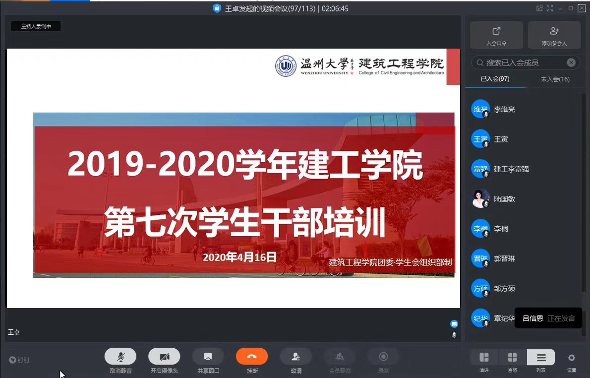 第七次学生干部培训“学生干部的情商培育与心理成长”在钉钉线上顺利开展。本次课程的主讲人为温州市教育局高等教育处副处长吕信恩老师。团委·学生会指导老师、辅导员刘良友老师担任本次培训课程的主持人,院研究生会、党员服务中心、团委·学生会全体成员及各班班委参加了本次课程。