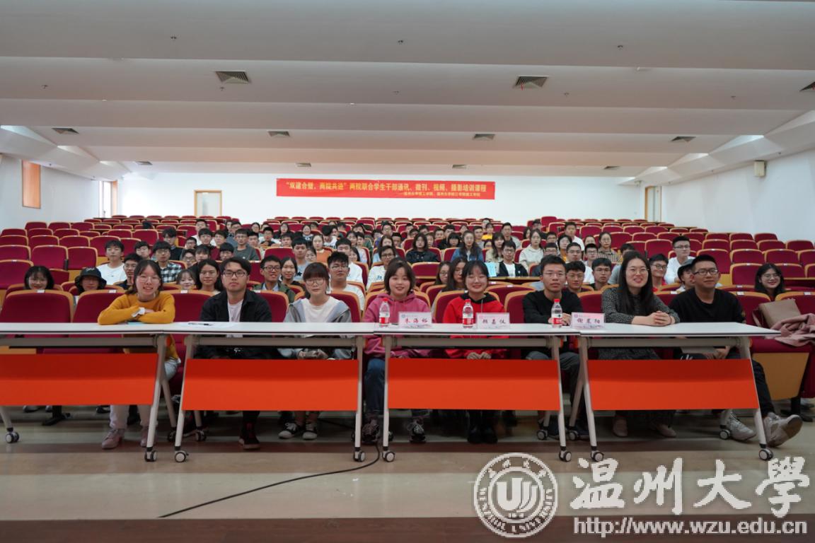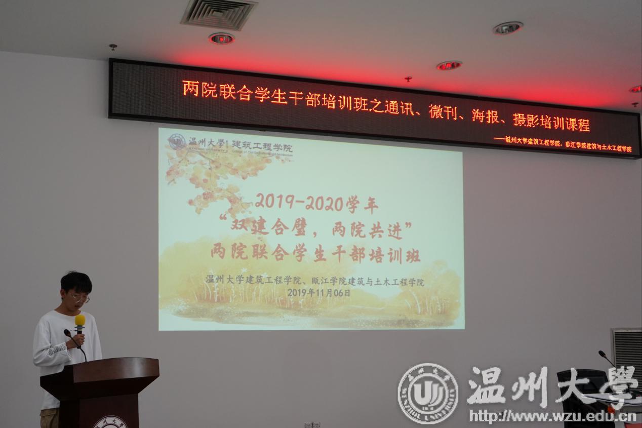 联合瓯江学院建筑与土木工程学院在南校岩松堂步青厅举办了一场以微刊、通讯以及摄影和海报为主题的讲座。本次培训讲座有幸邀请到了2019届建工团学编辑部部长顾嘉仪、记者团部长朱海裕和新宣部部长谢晨阳。