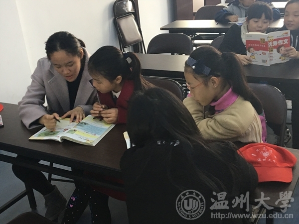 志愿者到达目的地。门还没开,却已经有两个孩子等在门口。不久,孩子们陆续到来,志愿者们安排好桌椅,安顿好每一个孩子。虽然这次大部分的志愿者们都没有志愿的经历,但只是少许的尴尬以后,很快就和孩子们融洽在了一起。志愿者们发现,每个孩子的性格和年龄是不同的。有的吵闹,有的需要安静的学习。志愿者们就与家长协商,将安静的孩子们和低龄的孩子们区分开管理。使得孩子们都能好好的得到学习的空间。志愿者们还积极回答小朋友们的问题,力求精准的给出正确的答案。