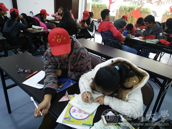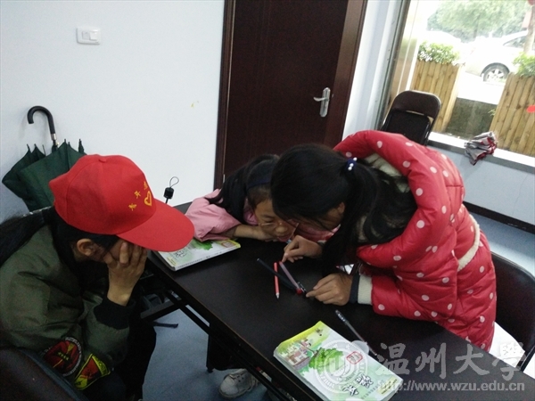 2016年11月26日12:40。雨一直下,公交车在行驶,志愿者情绪却一直高昂,期待着和小朋友们第一见面。40分钟的等待,志愿者们终于到了教学地点――南汇街龙源社区居家养老服务照料中心。在志愿者们整理好教室后,小朋友们也满脸笑容到达了教室,与志愿者们相视微笑,开始了新的周末,新的辅导,新的学习。雨一直下,滴答滴答声和屋内交流声融为一体,静谧而又热闹,志愿者们和小朋友们都在认真地交流,讨论,学习。每位志愿者都十分享受这种氛围,思考:雨天也许不是一件坏事。雨丝一根一根穿起珠子,漂亮而又蕴含着哲理。其中有一名小朋友十分乖巧,他早早做完作业缠着志愿者给他讲故事。这时志愿者王青青来到了他的跟前,坐在他旁边给他讲起了――十只兔子的故事,小朋友张着大眼睛专心致志的听着。虽然十只兔子的故事推理有点难度,但是小朋友还是听听的津津有味。志愿者慢慢引导着他动脑思考,尝试将人物关系图画出来,推出整个故事的前因后果,小朋友思考能力很棒,大概明白了十只兔子之间关系。后来,他们一起看了借鉴答案。答案多种多样,可以从不同的角度出发、思考,不同的角度,有着不一样的解释,不一样的看法,这也让志愿者明白了,我们在教导孩子时,问题不能有个标准答案,应该有个开放式的答案,引导孩子去动脑思考,形成他们自己的一套逻辑思维。