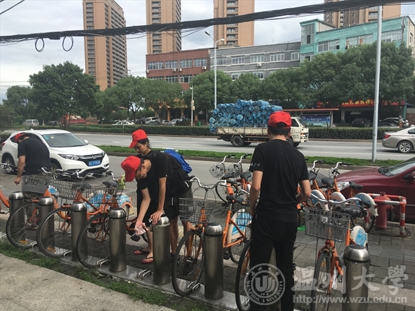 第二小分队带着饱满的精神到达了第一个站点—南白象,他们的志愿者任务是公共自行车清理。志愿者们打好水润湿抹布,开始了擦洗。因为公共自行车长时间曝晒淋浸在露天之下,车身显得比较破旧脏污。这不仅让我们志愿者意识到定时擦洗公共自行车这项活动的重要性,意识到我们的所作所为是有意义的,从而更加尽心尽力地付出,为这个城市的整体形象进步作出自己的一份努力。完成了第一个站点的清洗后,小队的成员对活动都有了初步的了解,大家整理的工具后,一起走路出发前往下一个站点,在路上成员们也很愉快地进行了彼此间的交流,大家收获的不仅是辛勤汗水付出背后的自豪感,更有团队作业时的快乐。