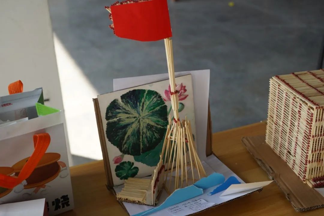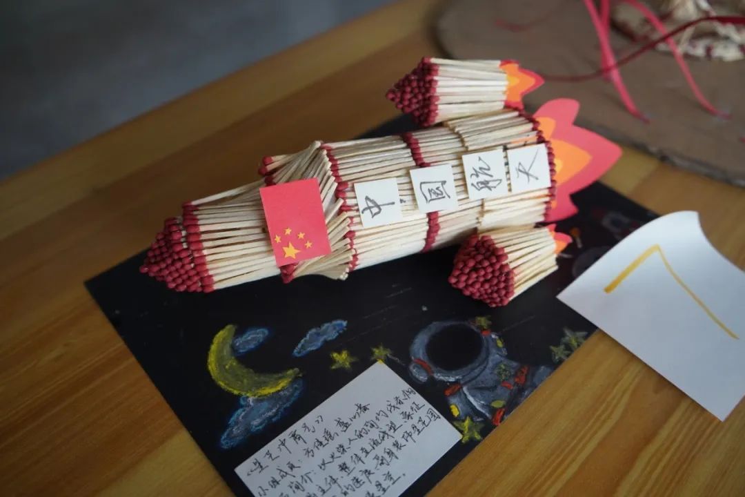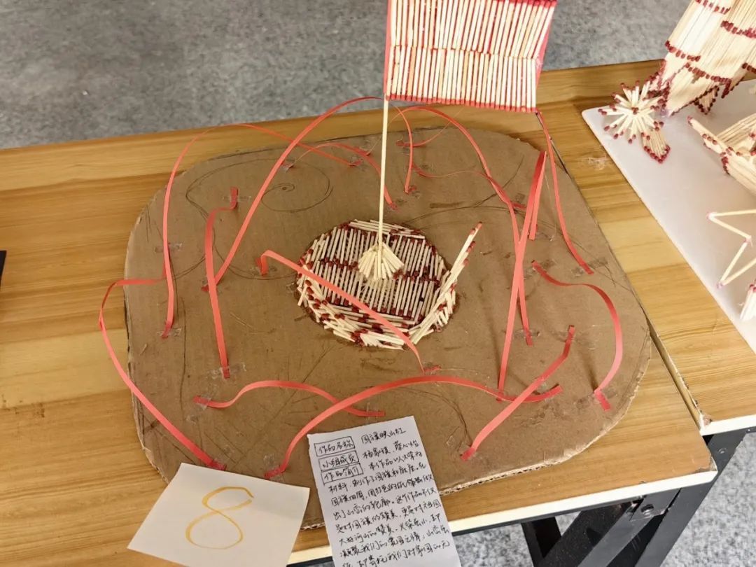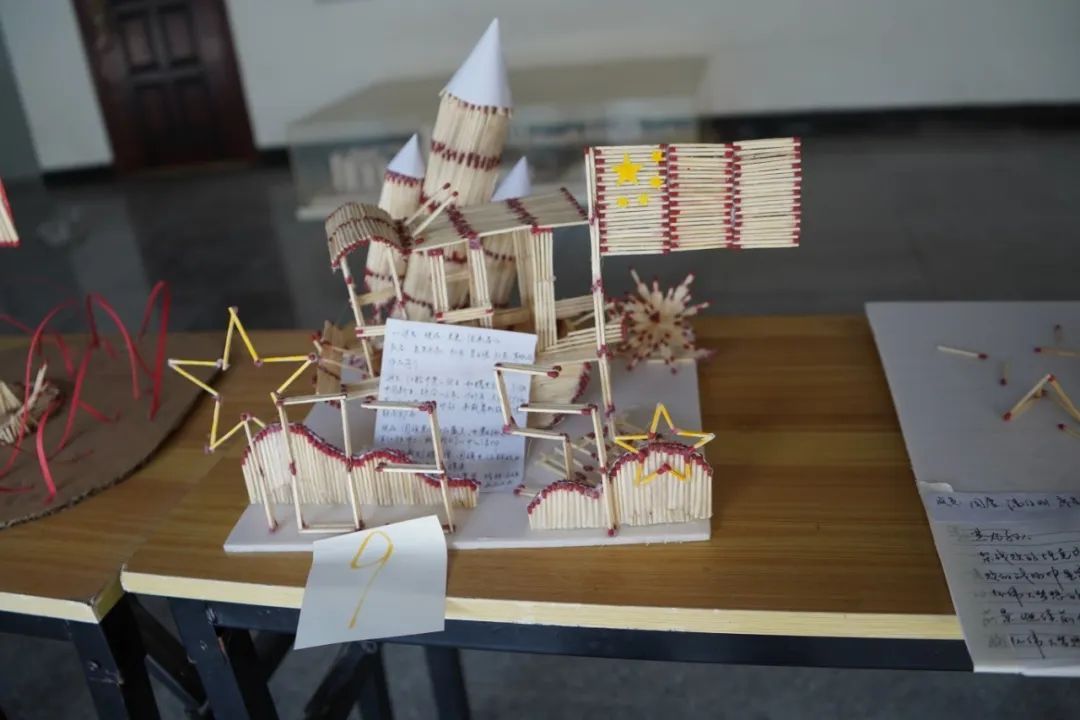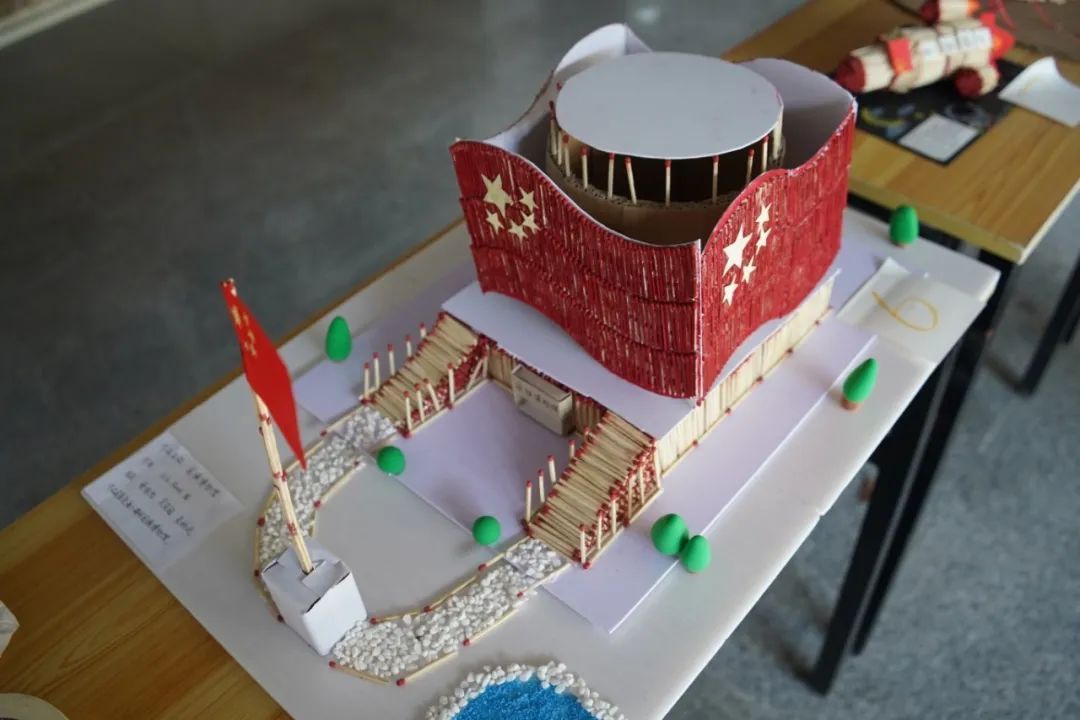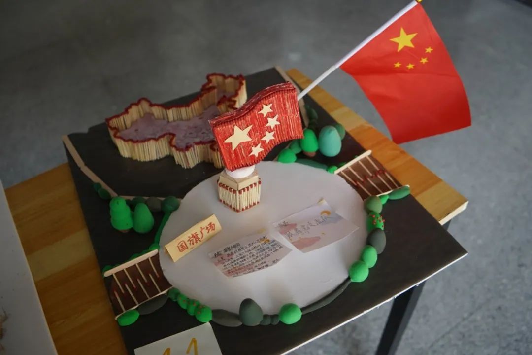 设计理念:本作品以火柴为材料,制作了国旗和底座。在国旗四周,用红色的纸做出了山峦的轮廓。这个作品不仅是对国旗的赞美,更是对祖国大好河山的赞美。火柴虽小,却凝聚我们的爱国之情;山峦虽纸,却寄托我们对家园的无限眷恋。
