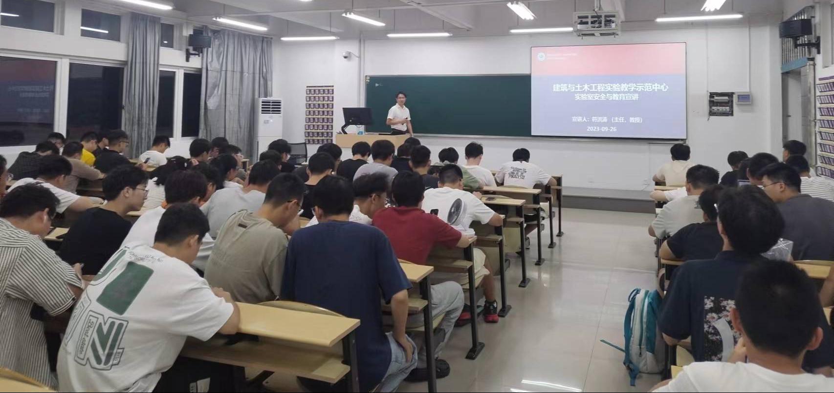 建筑工程学院2023级研究生实验室安全与教育宣讲会。学院实验中心教师、23级全体研究生共同参加,宣讲会由学院实验中心主任符洪涛教授主讲。