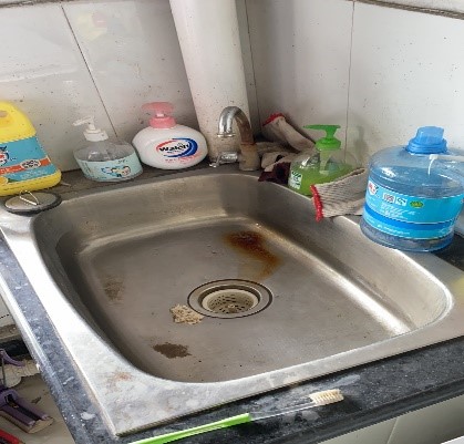 水池里沙子较多,水池台面堆放混乱 |