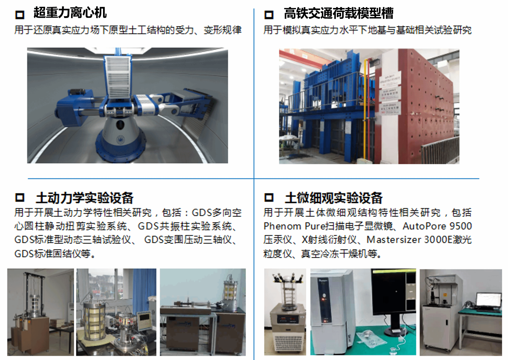 拥有超重力土工离心机系统、道基动力模型实验系统、电液伺服岩土动力分析振动台、GDS大型动三轴、GDS动静真三轴试验系统、GDS空心圆柱扭剪系统、电子万能试验机等国内外先进实验设备。此外,在建三向六自由度大型振动台(30t)、风洞等特色实验室。科研设备齐全,为从事该领域的科学研究、社会服务提供了良好的科研环境和测试手段。